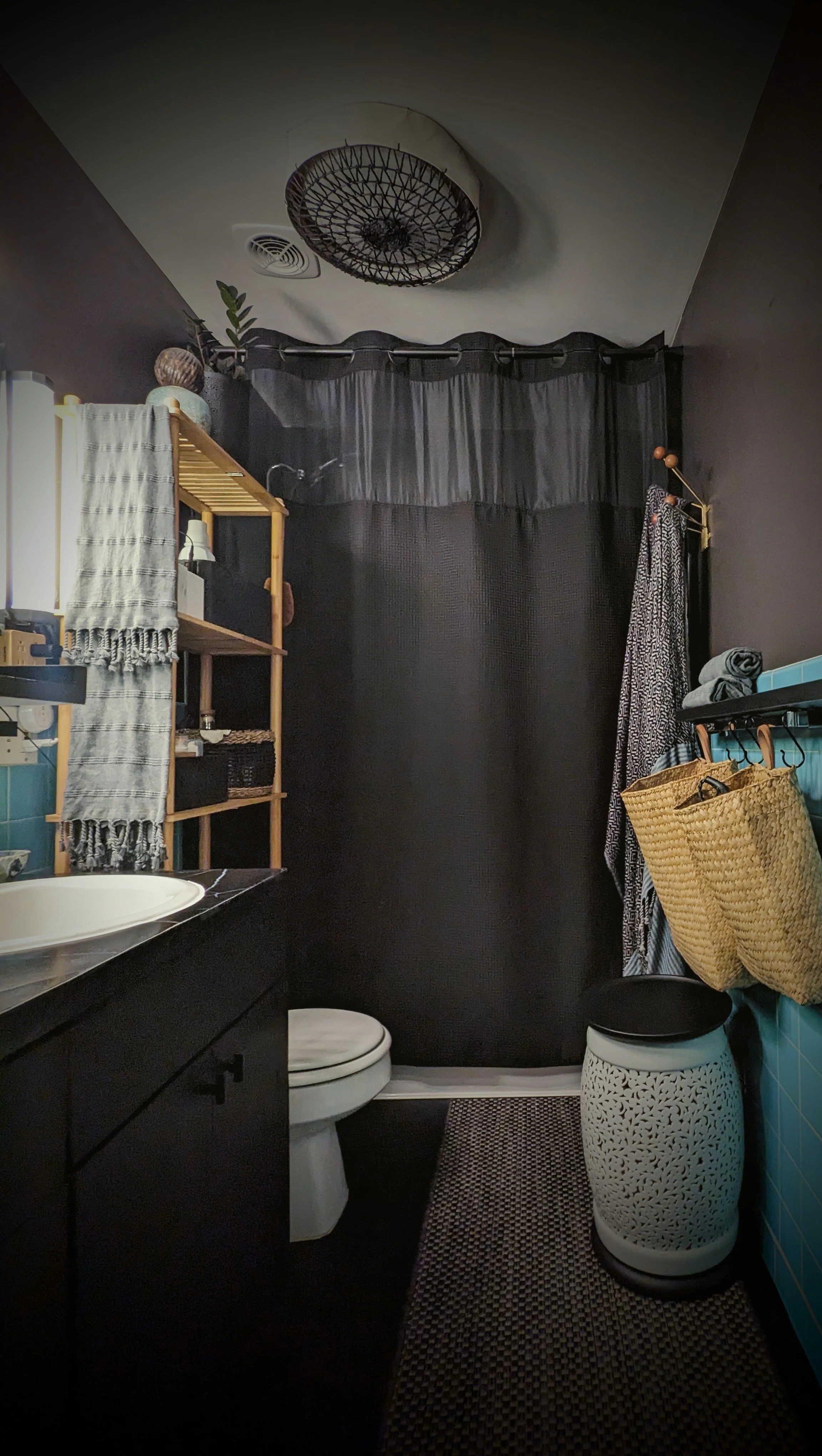 N Pearl bathroom In the mood for some drama, this small apartment bathroom got a facelift with creative renter friendly solutions.